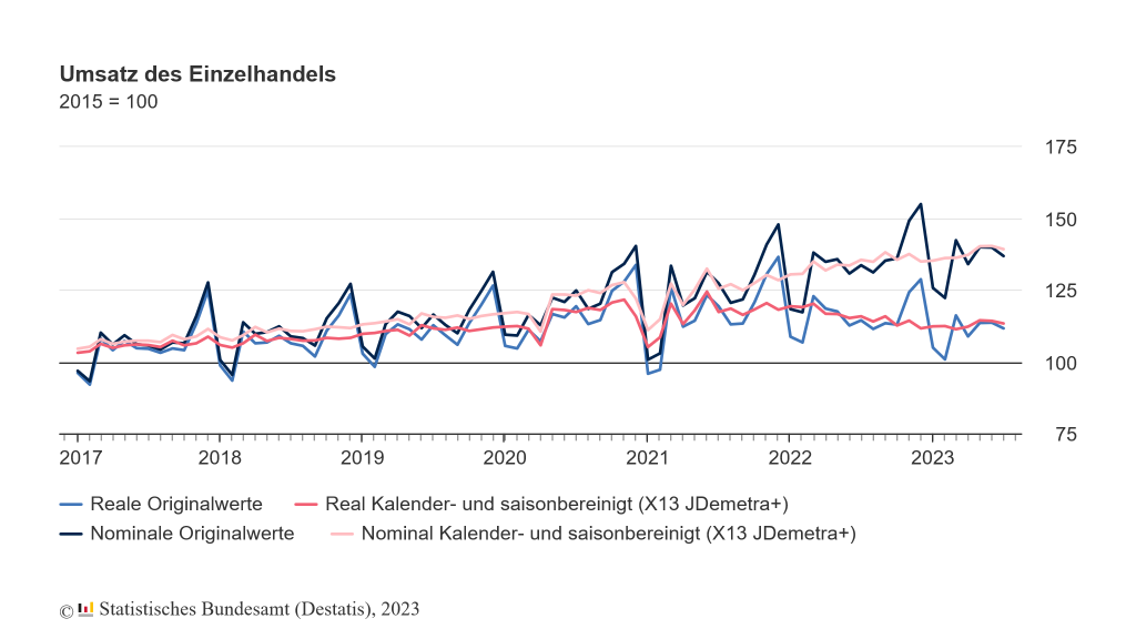 Im Vergleich zum Vorjahresmonat verzeichnete der Einzelhandel sogar ein reales Umsatzminus von 2,2 %, während auf nominaler Basis ein Umsatzplus von 2,7 % heraussprang. Dieses lässt sich mit der hohen Inflation, also den gestiegenen Preisen begründen. Die Einzelhandelsgeschäfte nehmen also durch die höheren Preise mehr ein, sie verkaufen aber zugleich weniger. Die hohen Preise drücken folglich den Konsum, was für die Wirtschaft ein Problem ist.