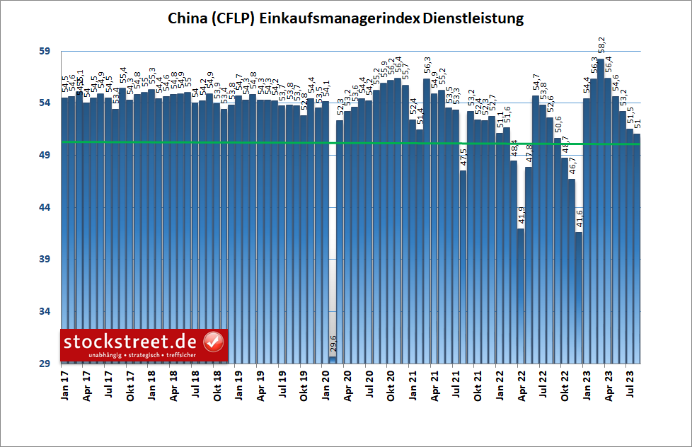 Zudem trübte sich die Stimmung im Dienstleistungsbereich weiter ein. Der offizielle Service-Index gab zum 5. Mal in Folge nach, von 51,5 auf 51,0 Punkte. Immerhin hielt er sich damit weiterhin oberhalb der Wachstumsschwelle.