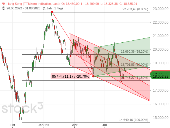 Dementsprechend haben die Anleger am Aktienmarkt jüngst auch ein recht klares Urteil gefällt: Der chinesische Aktienindex Hang Seng brach klar nach unten aus dem flachen Aufwärtstrendkanal aus (grün im folgenden Chart), der sich damit wie in der Börse-Intern vom 15. August beschrieben als eine Flagge im übergeordneten Abwärtstrend herausgestellt hat (siehe „Schon wieder belasten schwache Daten aus China den Markt“). Bei dem bearishen Ausbruch erreichte der Index wieder das untere Ende des engen Abwärtstrendkanals (dunkelrot), womit sogar inzwischen mehr als 61,80 % des starken Aufwärtsimpulses vom Jahreswechsel korrigiert wurden – ein weiteres bearishes Signal.