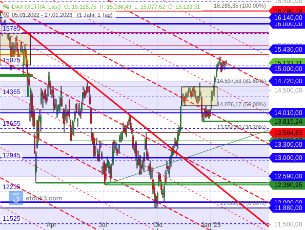 Denn der Index hat es mit einer Konsolidierungslinie zu tun (rot gestrichelt), die ihn um die Mittellinie bei 15.075 Punkten pendeln lässt. Zudem befinden sich die Kurse derzeit in der Nähe von 15.000 Zählern (dicke blaue Linie). Solche runden Marken sind psychologisch wichtig und üben stets eine gewisse Anziehungskraft auf die Anleger aus.