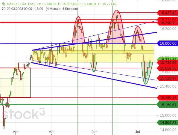 Beim DAX sind wahrscheinlich viele Trader frische Long-Positionen eingegangen, als der Index auf neue Rekordhochs ausbrach. Und als die Kurse unter die 16.000er Marke zurückfielen und sich die Ausbruchsversuche damit als Bullenfallen entpuppten (rote Bögen), wurden viele Positionen mit Verlust beendet.
