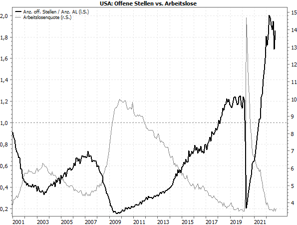 Vorerst bleibt ein solcher Wert jedoch unwahrscheinlich. Der Grund: Die Zahl der offenen Stellen bleibt weiterhin sehr hoch – das Verhältnis der Zahlen von offenen Stellen und Arbeitslosen notiert weiterhin in der Nähe seines historischen Hochs vom März 2022 bei 2: