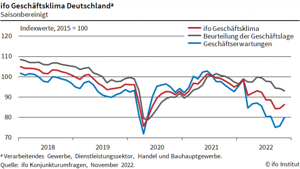 Nach dem Einkaufsmanagerindex von S&P Global (siehe vorgestrige Börse-Intern) hat sich auch das ifo-Geschäftsklima gebessert. Der Stimmungs- und Frühindikator vom Münchner ifo-Institut legt im November um 1,8 auf 86,3 Punkte zu.