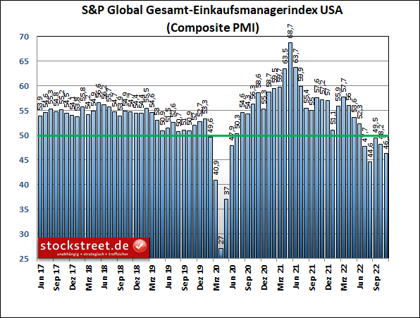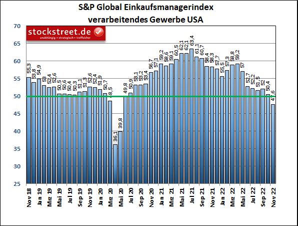 Interessanter ist daher ein Blick auf die jüngsten Stimmungsdaten aus den USA. Der Einkaufsmanagerindex (PMI) von S&P Global hat sich laut der vorgestrigen Schnellschätzung überraschend stark eingetrübt. Er gab im November um 1,9 auf 46,3 Punkte weiter nach.