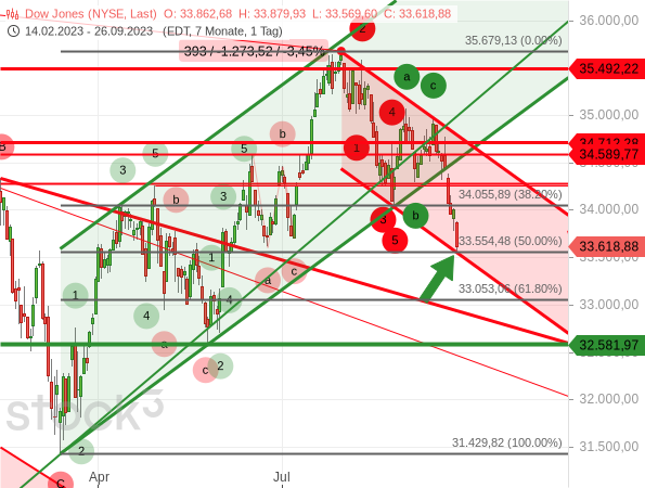 Die US-Aktienindizes Dow Jones und S&P 500 befinden sich zeitgleich in charttechnisch interessanten Situationen. So hat der Dow Jones vorgestern exakt die untere Linie eines Abwärtstrendkanals erreicht (siehe grüner Pfeil im folgenden Chart).