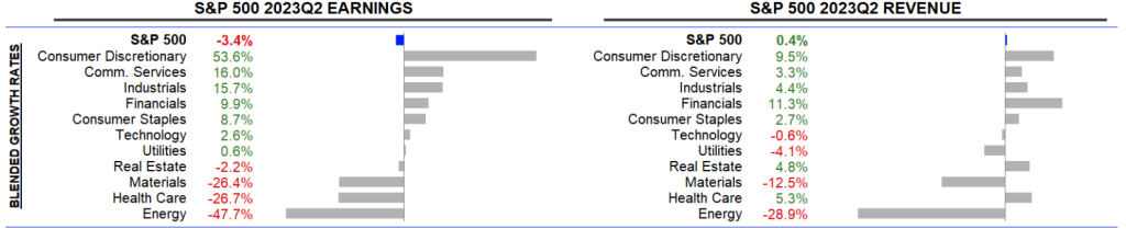 Auch für die US-Unternehmen lief es im 2. Quartal 2023 alles andere als berauschend. Die Umsätze der im S&P 500 versammelten Konzerne stiegen im Durchschnitt lediglich um 0,4 %, die Gewinne gaben sogar um -3,4 % nach.