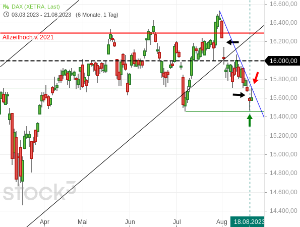 Zwischenzeitlich rutschte der DAX sogar fast auf das Tief vom Juli zurück (siehe folgender Chart).