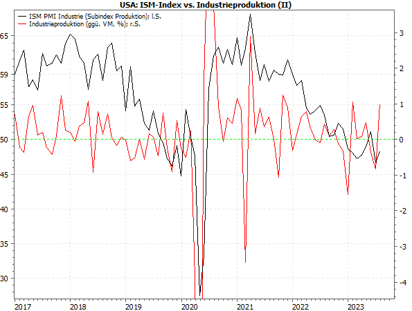 Aber ich habe den „Industrie-Index“ bewusst gewählt, denn er lässt sich viel besser mit den Daten eines „harten“ Indikators vergleichen, und zwar der Industrieproduktion. Zumal der ISM-Index aus mehreren Teilindizes besteht (z.B. Auftragseingänge, Beschäftigung, Preise), zu denen auch das Produktionsniveau selbst gehört.