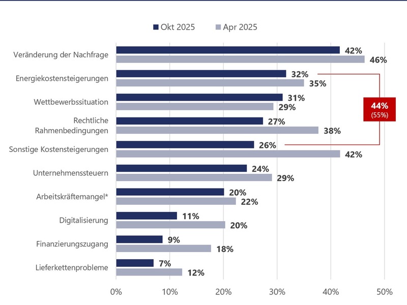 Für die kommenden Jahre plant ein Großteil der Befragten Investitionen: 78 Prozent der Unternehmen wollen in den kommenden Jahren in Digitalisierung/Automatisierung investieren, dicht gefolgt von Geschäftsausstattung sowie Produkt- und Serviceerweiterungen. Es zeigt sich gleichzeitig eine Verschiebung der Prioritäten: Ausgaben für Nachhaltigkeit und Energieeffizienz verlieren an Relevanz (-12 Prozentpunkte zum April 2025). Das Investitionssofortprogramm der Regierung zeigt Wirkung: 46 Prozent der Kleinunternehmen, die in Geschäftsausstattung investieren wollen, nennen die neuen degressiven Abschreibungsmöglichkeiten als wesentlichen Impuls.