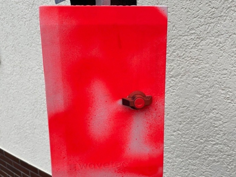 Bisterschied (Donnersbergkreis) - Im Zeitraum vom 30.09. bis 08.10.2025 wurde ein in der Hauptstraße zur Verkehrszählung aufgehängter "Traffic Counter" der Verbandsgemeinde Nordpfälzer Land von unbekannten Tätern mit roter Farbe besprüht.