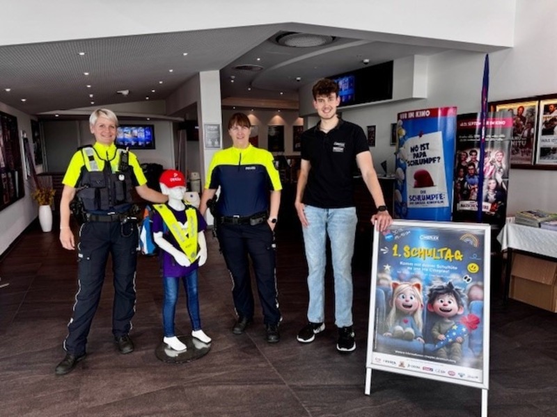 09.09.2025 - 10:40:56Reflektoren retten Leben - Verkehrssicherheit auf dem Schulweg. Von 14:00 bis 17:00 Uhr waren die Schulanfängerinnen und -anfänger mit ihren Schultüten eingeladen, um den Start in den neuen Lebensabschnitt gemeinsam zu feiern. Die Kinomitarbeiterinnen und -mitarbeiter hatten dafür viele kleine Überraschungen vorbereitet, um auch die Tüten der Kinder zu befüllen. Ein besonderer Programmpunkt war der Besuch der Verkehrssicherheitsberaterinnen, Polizeihauptkommissarin Becker und Wagner von der Kreispolizeibehörde Hochsauerlandkreis. An ihrem Stand konnten Kinder und Eltern spielerisch lernen, wie wichtig Sichtbarkeit im Straßenverkehr ist. Mithilfe einer sogenannten "Dunkelbox" wurde eindrucksvoll gezeigt, wie sehr Reflektoren in der Dunkelheit dazu beitragen, rechtzeitig gesehen zu werden. Dabei wurde den Eltern auch gezeigt, dass selbst ein helles T-Shirt nicht ausreicht, um im Straßenverkehr richtig gesehen zu werden und sie somit nicht sicher unterwegs sind. Anhand der Schaufensterpuppe wurde außerdem demonstriert, wie stark Reflektoren bereits bei Tageslicht wirken.