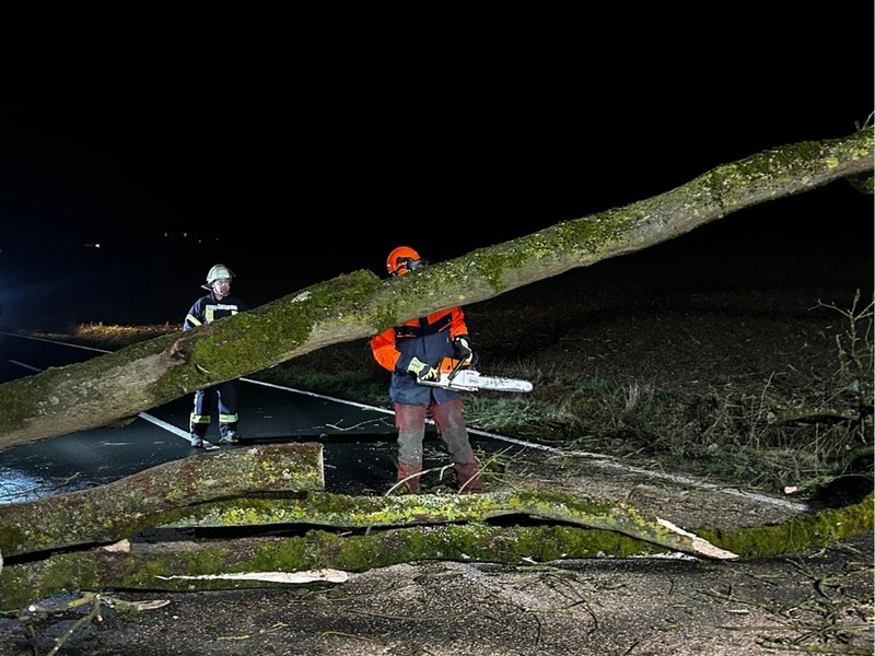 Der Baum wurde mithilfe einer Motorsäge zerkleinert und anschließend von der Fahrbahn entfernt. Im Anschluss reinigten die Einsatzkräfte die Straße von Ästen, Laub und weiterem Restmaterial, um die Verkehrssicherheit wiederherzustellen.