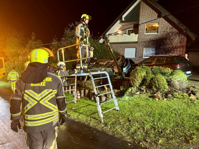 14.09.2025 - 08:10:30FW Hünxe: Pkw landet im Vorgarten auf dem Dach. Hünxe - Die Einheit Hünxe wurde am 13. September 2025 um 20:33 Uhr mit dem Einsatzstichwort "Auslaufende Betriebsmittel" zum Hohlbachweg im alarmiert.