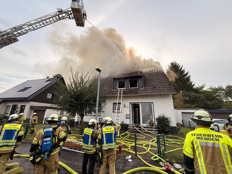 07.09.2025 - 10:24:03FW Menden: Brand eines Einfamilienhauses auf dem Sauerfeld - mehrere Personen mit Rauchgasintoxikation. Bereits auf der Anfahrt waren dichte Rauchschwaden sichtbar, die über den gesamten Ortsteil zogen.