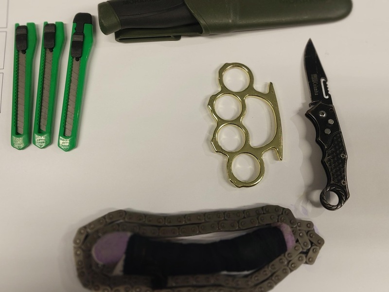 Bei der Durchsuchung des Autos wurden durch die eingesetzten Bundespolizisten im Handschuhfach griffbereit ein verbotener Schlagring, ein verbotenes Springmesser, eine zum Schlagwerkzeug umfunktionierte Antriebskette, ein Jagdmesser und drei Cuttermesser aufgefunden und sichergestellt.