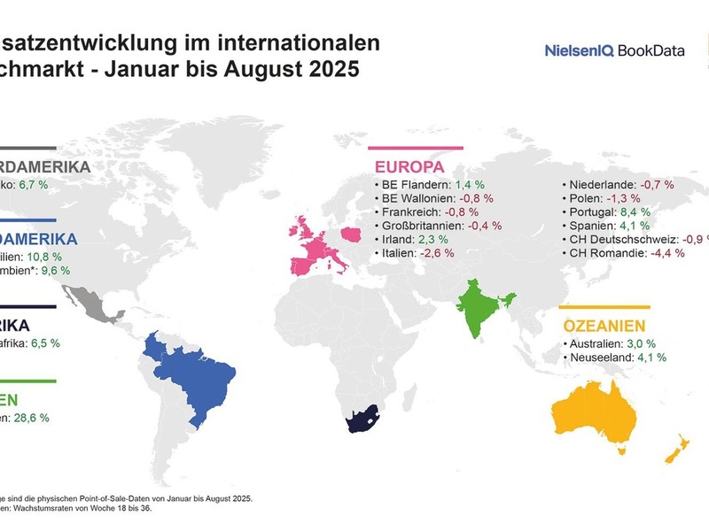 Die Lesenationen Frankreich und Großbritannien, mit jeweils 186 Millionen bzw. 115 Millionen verkauften Büchern die größten Märkte innerhalb der Auswertung, beendeten die ersten acht Monate 2025 mit einem leichten Umsatzminus von -0,8 Prozent bzw. -0,4 Prozent. Auch die Niederlande (-0,7 Prozent), Polen (-1,3 Prozent), die deutschsprachige Schweiz (-0,9 Prozent) und Italien (-2,6 Prozent) verzeichneten Einbußen. Den größten Rückgang gab es in der französischsprachigen Schweiz, der Romandie (-4,4 Prozent).