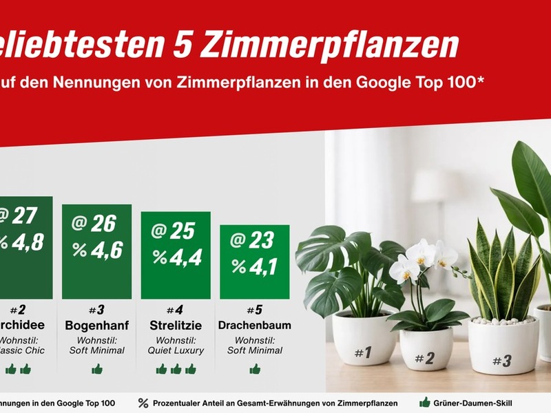 26.01.2026 - 09:00:18Für die Analyse hat toom die deutschen Top-100-Google-Ergebnisse zu den Suchanfragen "beliebteste Zimmerpflanzen" und "beliebteste Küchenkräuter" ausgewertet und gezählt, welche Pflanzen in redaktionellen Beiträgen besonders häufig genannt werden. Die Ergebnisse zeigen: Gefragt sind vor allem Pflanzen, die sich unkompliziert pflegen lassen und gut zum individuellen Lebensstil passen.