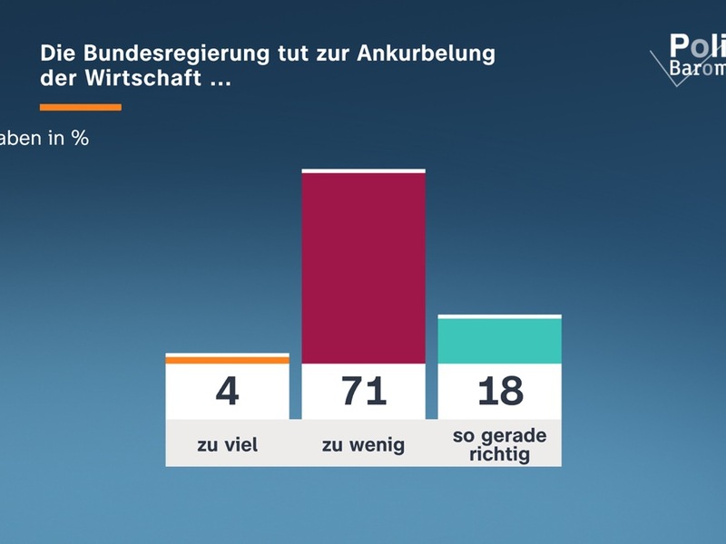 Die Unzufriedenheit mit der Wirtschaftspolitik der Bundesregierung ist weiterhin groß: 71 Prozent der Befragten und Mehrheiten in allen Parteianhängergruppen meinen, die Bundesregierung tue zu wenig zur Ankurbelung der Wirtschaft. Für 4 Prozent tut sie diesbezüglich zu viel und für 18 Prozent sind die Maßnahmen so gerade richtig.