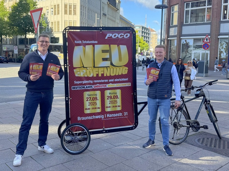 Ein eindrucksvolles Beispiel liefert die Zusammenarbeit mit POCO: Zur Neueröffnung einer Filiale buchte das Möbelhaus zunächst fünf Werbefahrräder. Die Resonanz war überwältigend: Hunderte Gespräche mit Passanten, spürbar steigende Aufmerksamkeit und emotionale Reaktionen vor Ort. Begeistert erweiterte POCO beim nächsten Mal auf sieben, später auf zehn Werbefahrräder – und machte die mobile Kampagne zum festen Bestandteil seines Marketingmixes. „Wenn ein Kunde einmal bucht, bucht er oftmals direkt wieder, weil der Effekt sofort sichtbar ist und sich direkt auf die Wahrnehmung der Marke auswirkt“, betont Carlos Sievers.