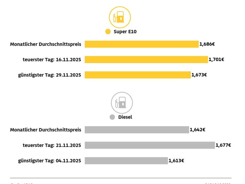 Günstigster Tag zum Tanken war bei Benzin am 29. November, als ein Liter Super E10 1,673 Euro kostete. Am teuersten war Super E10 am 16. November mit einem Tagesmittel von 1,701 Euro - die Schwankungen innerhalb des Monats waren somit insgesamt gering. Deutlich ausgeprägter waren die Preisbewegungen bei Diesel. So war der Literpreis mit 1,613 Euro am 4. November auf dem Monatstiefststand. Am 21. November erreichte der Diesel-Preis mit 1,677 Euro seinen Monatshöchststand.