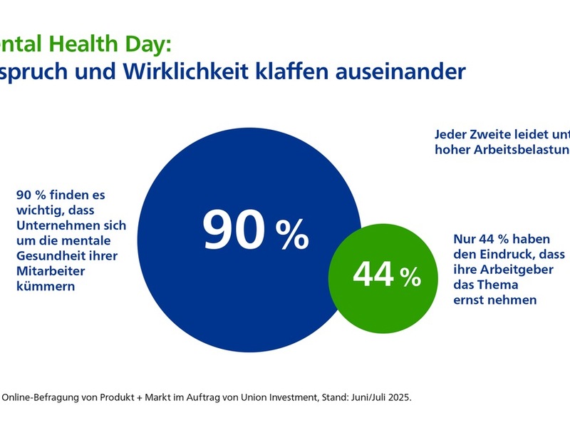 Mentale Gesundheit ist für Erwerbstätige in Deutschland längst kein Randthema mehr - sondern ein zentrales Anliegen: 90 Prozent halten es für wichtig, dass sich Unternehmen um die mentale Gesundheit ihrer Mitarbeitenden kümmern. Doch in vielen Betrieben wird das Thema noch unzureichend beachtet. Nur 44 Prozent haben den Eindruck, dass ihre Arbeitgeber das Thema ernst nehmen und fordern angesichts hoher Arbeitsbelastung konkrete Maßnahmen. Künstliche Intelligenz und Automatisierung könnten hier Entlastung bringen, werden bislang jedoch nur selten eingesetzt. Das sind die Ergebnisse einer repräsentativen Online-Befragung von Union Investment unter mehr als 1.000 Berufstätigen in Deutschland.