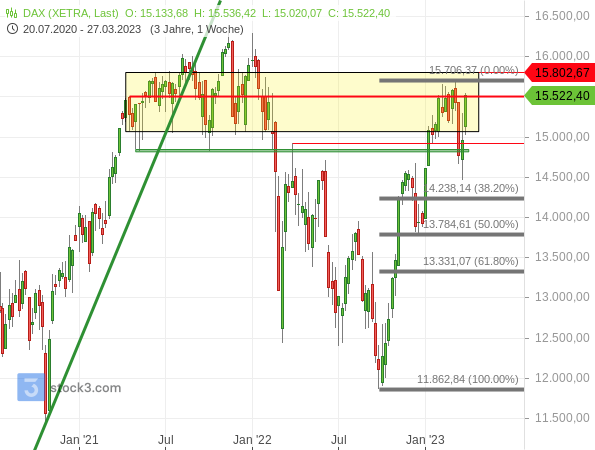 Und auch der folgende langfristige Wochenchart wirkt alles andere als bearish. Schließlich zeigt er, dass sich der DAX auch wieder in die Seitwärtsrange zurückarbeiten konnte, die 2021 relevant war, als der deutsche Leitindex ein großes Top ausbildete. Durch die Rückkehr in diese Range ist auch dessen bearishe Wirkung neutralisiert.