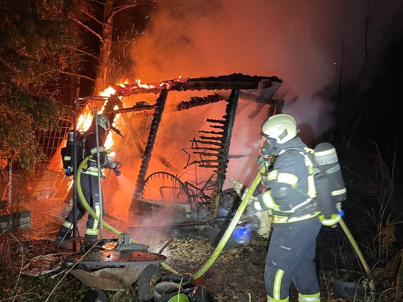 Feuerwehr, Brand FW Dinslaken: Feuer zerstört zwei Gartenlauben