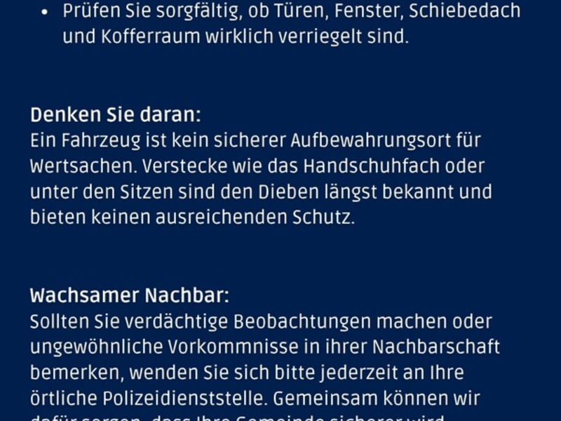 Die Polizei appelliert daher an alle Fahrzeughalterinnen und -halter, ihr Fahrzeug stets ordnungsgemäß zu verschließen und keine Wertgegenstände sichtbar zurückzulassen. Kleine Maßnahmen können helfen, große Schäden zu verhindern.