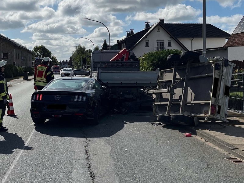 Ein Hüllhorster befuhr gegen 11:25 Uhr mit seinem Ford Mustang die Hauptstraße aus Richtung Ahlsener Straße kommend. Aus bislang ungeklärter Ursache prallte das Auto auf Höhe der Ziegelstraße gegen einen am rechten Fahrbahnrand geparkten Pritschenwagen samt Anhänger. Durch die Wucht der Kollision kippte der Anhänger um und kam auf dem Gehweg zum Liegen. Personen befanden sich weder im Fahrzeuggespann noch auf dem Gehweg.