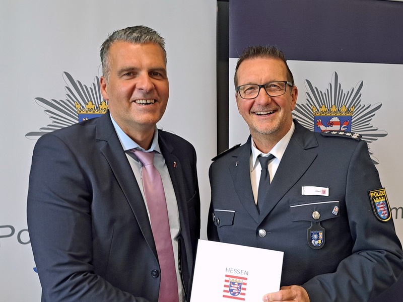 30.09.2025 - 14:23:51Ober-Ramstadt: Dirk von Hammel ist der neue Chef der Polizeistation. Ober-Ramstadt - Polizeivizepräsident Dirk Fornoff beglückwünschte am 30. September 2025 den Ersten Polizeihauptkommissar Dirk von Hammel zur Übernahme der Leitung der Polizeistation Ober-Ramstadt.
