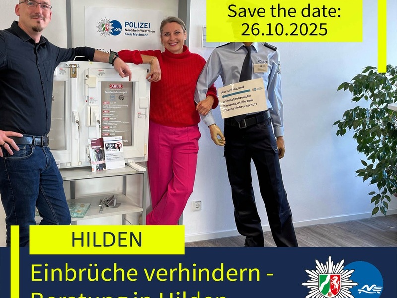 16.10.2025 - 08:19:48Riegel vor. Sicher ist sicherer - Polizei berät zum Thema Einbruchschutz - 2510060. Hilden - Die dunkle Jahreszeit ist Hauptsaison für Wohnungseinbrüche. Aus diesem Grund beteiligt sich die Kreispolizeibehörde Mettmann am Sonntag, 26. Oktober 2025, unter dem Motto "Riegel vor - sicher ist sicherer" am landesweiten Aktionswochenende gegen Einbruchsdelikte. Dazu lädt die Polizei Bürgerinnen und Bürger in der Zeit von 10 bis 17 Uhr in die Räumlichkeiten der Kriminalprävention in der Hildener Polizeiwache an der Kirchhofstraße 31 zu einem Beratungstag ein.