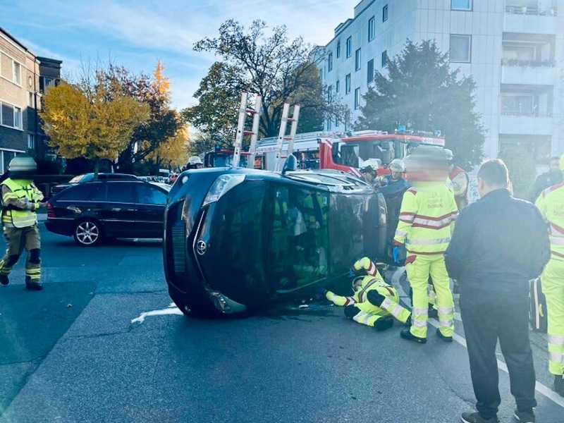 07.11.2025 - 12:17:03Wanheimerort: Unfall im Kreuzungsbereich - Auto kippt auf die Seite. Duisburg - An der Kreuzung Hultschiner Straße/Nikolaistraße kam es am Donnerstagmorgen (6. November, 9:15 Uhr) zu einem Verkehrsunfall mit zwei Verletzten. Nach bisherigen Erkenntnissen fuhr ein 67-jähriger Fahrer eines grauen Toyota von der Nikolaistraße kommend in den Kreuzungsbereich ein und stieß dort mit dem schwarzen Mercedes einer 32-Jährigen zusammen, welche die Hultschiner Straße in Richtung der Rheintörchenstraße befuhr.