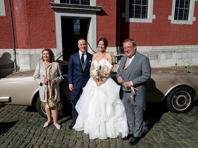 Stolz zeigte das Brautpaar vor der Kirche die Trauringe und Laschet küsste seine Frau. Dann fuhren die Frischvermählten unter dem Beifall der Zuschauer in einem luxuriösen offenen Oldtimer davon.