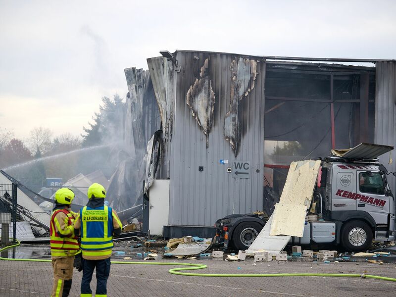 Die Feuerwehr berichtete, die Explosion am Freitagmorgen habe einen Brand ausgelöst. Die Halle der Lkw-Werkstatt in der Nähe einer Tankstelle wurde zerstört. Mehrere Fahrzeuge auf dem Gelände wurden beschädigt. Ein Tor der Halle flog durch die Druckwelle der Explosion etwa 15 Meter weit durch die Luft, wie ein Feuerwehrsprecher schilderte. Am Vormittag hatten die Einsatzkräfte den Brand unter Kontrolle.