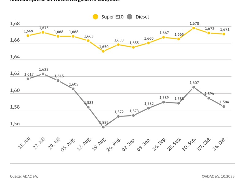 15.10.2025 - 12:16:29Erneut leichter Preisrückgang an den Zapfsäulen / Diesel im Wochenvergleich um einen Cent günstiger / Auch Super E10 minimal billiger. Laut aktueller ADAC Auswertung sind die bundesweiten Durchschnittspreise sowohl für Benzin als auch für Diesel im Wochenvergleich zurückgegangen. Ein Liter Super E10 kostet derzeit im Mittel 1,671 Euro - das sind 0,1 Cent weniger als noch in der Vorwoche. Diesel verbilligte sich um 1,0 Cent und liegt aktuell bei 1,584 Euro je Liter. Damit setzt sich der Trend leicht sinkender Preise fort, bei Diesel erneut deutlicher als bei Benzin.