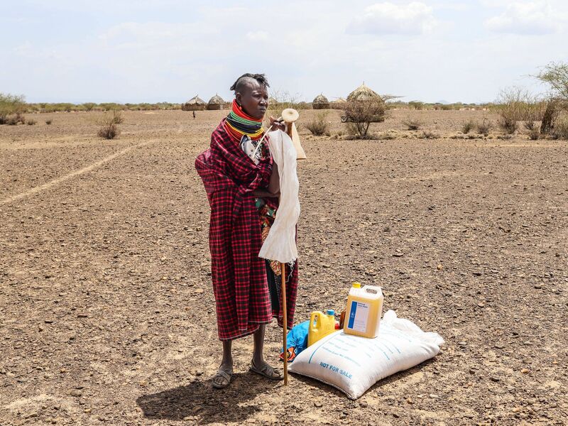 Ein Viehhirte vom Volk der Samburu im Norden Kenias tränkt Rinder (Archivbild) - Foto: Brian Inganga/AP/dpaFür Nomaden wie die Massai oder Samburu ist der Verlust von Weideland durch Dürre und Klimawandel existenzbedrohend (Archivbild) - Foto: Brian Inganga/AP/dpaDürren treten in Ostafrika und am Horn von Afrika häufiger und in kürzeren Abständen auf. (Archivbild) - Foto: Ben Curtis/dpaEine Frau steht in Kenia neben einer Lebensmittelration des Welternährungsprogramms (WFP). - Foto: Patrick Ngugi/AP/dpa